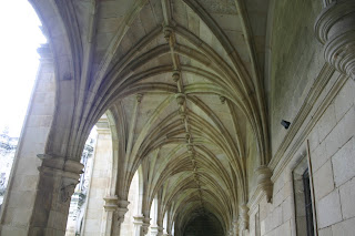 El jardín del claustro de la parte del monasterio donde hay dependencias municipales, la diferencia es patente… Es un buen ejemplo de los ritmos constructivos, abajo más sobrio y «machacón» (como el bajo), el siguiente piso siguiendo ese ritmo pero con más «adornos» y arriba con muchas variaciones (las gárgolas en la parte alta son todas distintas, como se ve en la foto de aquí abajo)